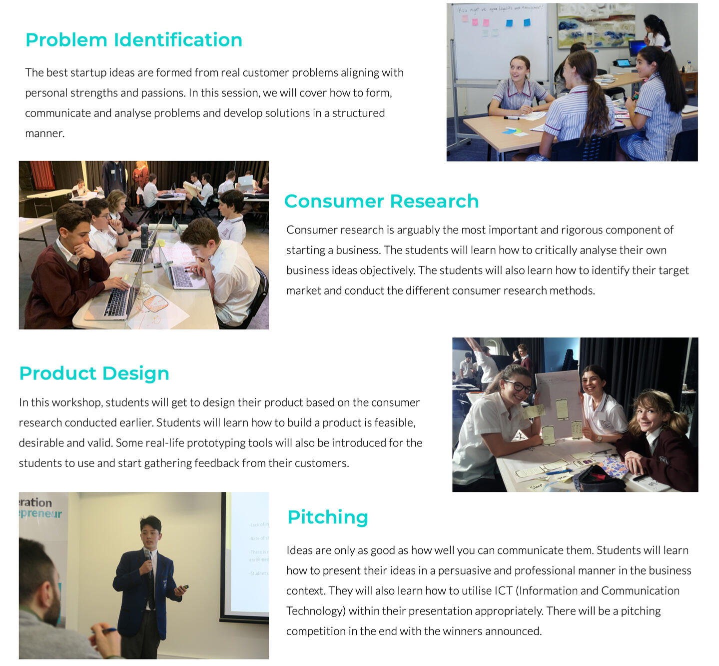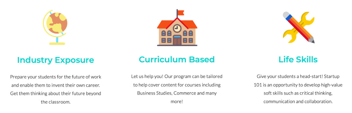 Q. Does the program have to be run in one day?A. Our Startup 101 workshops are held over one whole school day.Q. What kind of students would benefit the most from this program?A. We recommend this program to be run for students in years 9-12, who are either studying commerce or business studies, or students who are keen to learn practical skills or run their own projects.Q. Where is the program held?A. Most of our programs are held in the school, but we do organise external venues (e.g. Corporate offices and co-working spaces) if requested.Q. How much does it cost?A. Cost of the program depends on the number of students and the venue. Please contact us for more information.